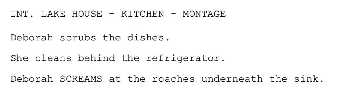 The format examples above are designed to show format options, so they lack any kind of story or POV. And that's what we need to actually write a montage.