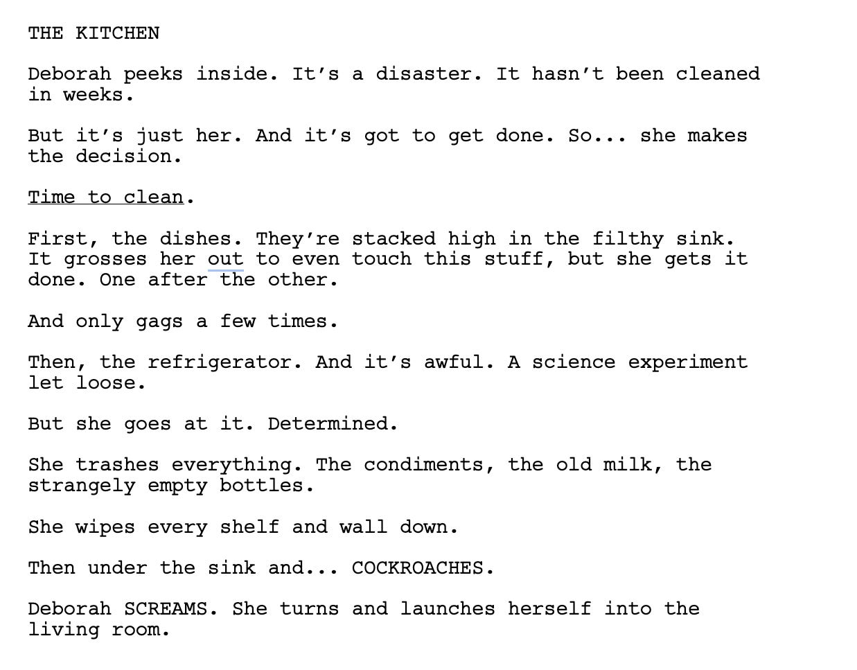 That's it. I want the reader's eyes to go down the page so they see, hear, and feel the movie.