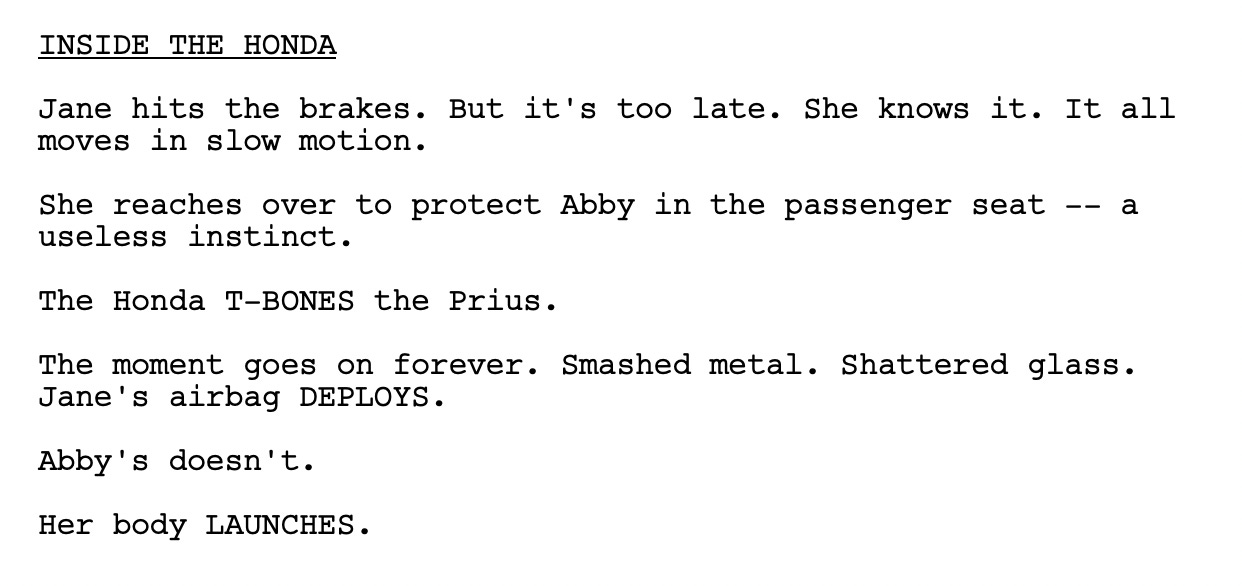 What we really want is the emotion. Who's driving? Who's hurt? Who do we care about?